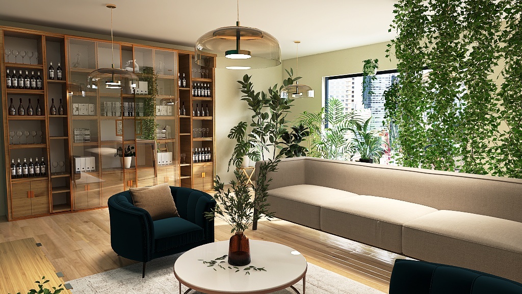 Рабочее место у окна отделено стеной из растений, за ней гостиная - достаточно уютная, чтобы не казаться, что находишься в пустой комнате. Когда к хозяйке приходят гости, диван становится под стену, а кресла выносятс ближе к растениям, таким образом получается просторное пространство для вечеринок. В комнате есть достаточно большая система храннения, за счет высоты и размера, она растворяется и не бросается в глаза. Для создания ощущения уединенности и интимности, одна из стен выкрашена в более глубокий цвет.