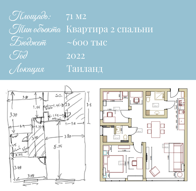 Работать с клиентами, которые чётко знают, чего хотят — всегда увлекательно и приятно. Для этой квартиры в Таиланде заказчица предоставила отличные референсы с продуманной цветовой гаммой, что стало отличной основой для проекта.